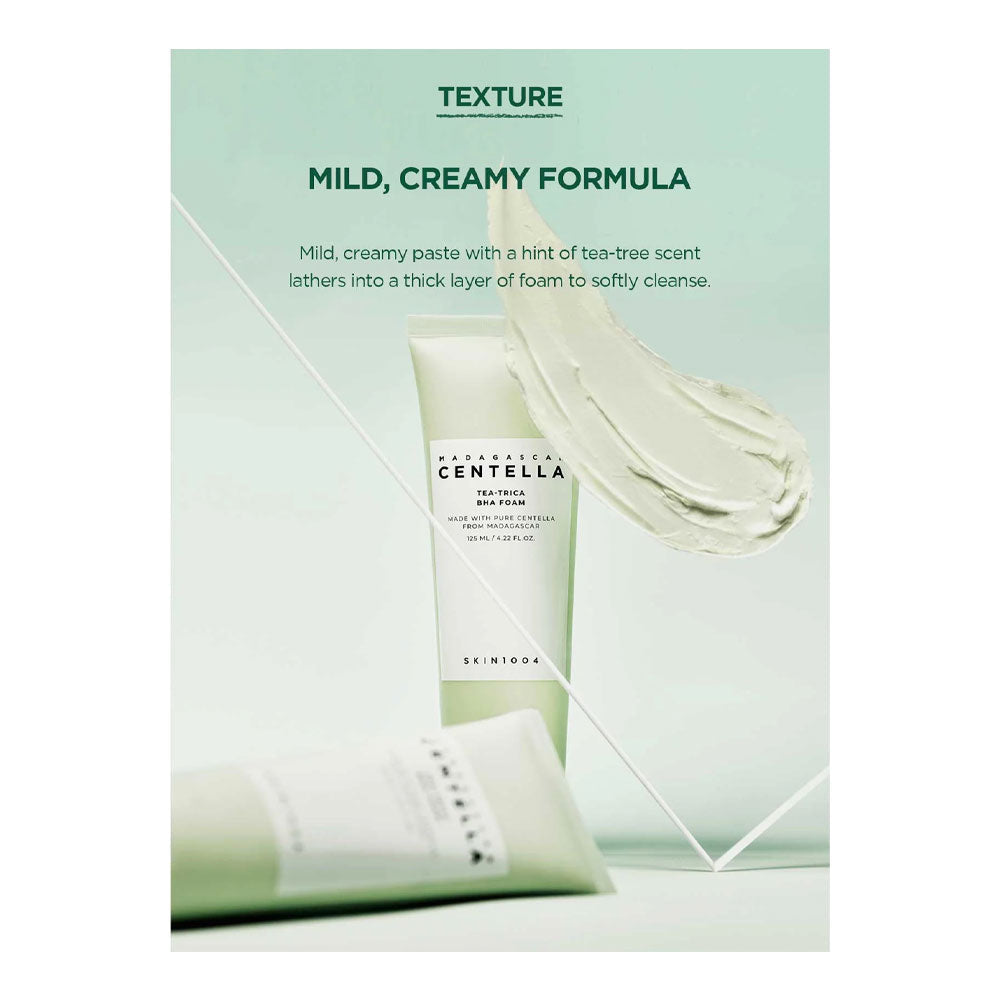 Achieve clear, healthy skin with the SKIN1004 Madagascar Centella Tea-Trica BHA Foam, a gentle yet effective foam cleanser designed for acne-prone skin. This K-beauty product is formulated with Centella Asiatica, Tea Tree Leaf Water, and Salicylic Acid, which work together to calm skin irritation, remove excess sebum, and exfoliate dead skin cells. Infused with glycerin, it also hydrates your skin, leaving it feeling refreshed without stripping away moisture. Ideal for those with sensitive skin, it offers a mild yet powerful solution for acne and clogged pores.